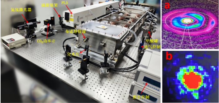 图1 二氧化碳泵浦太赫兹双频激光器及其输出光斑(a.光束仪测量;b.太赫兹相机测量)